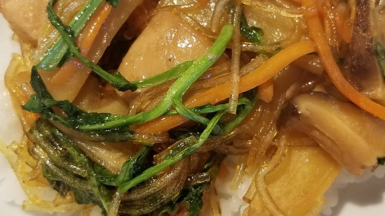It is a chicken with vegetables and noodles seasoned with soy sauce mirin sesame seed and chicken broth. Take a look at this recipe courtesy of Sam Choy. 19k Views 0 Votes.